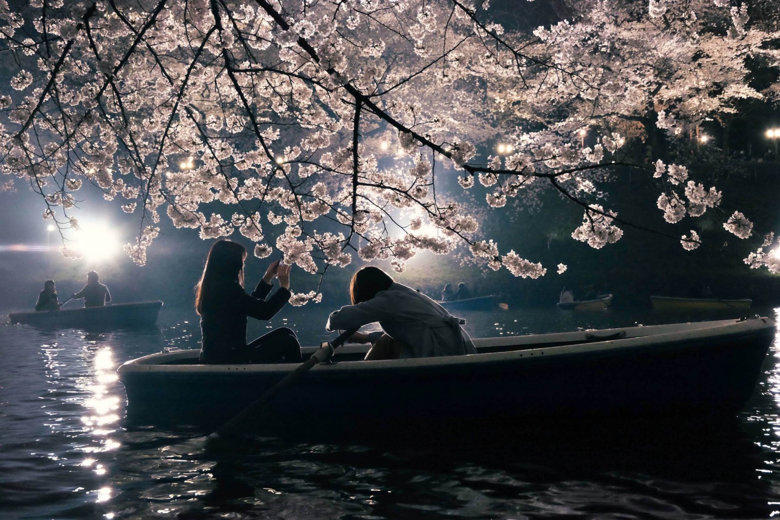 Pendant le pic de la floraison (souvent de fin mars à début avril), tous les cerisiers sont éclairés et rendent le lieu absolument magique. Je vous conseille vivement de louer une petite barque (800 yen, environ 7 euros) dès que la nuit est tombée !
